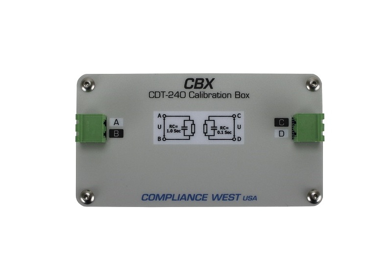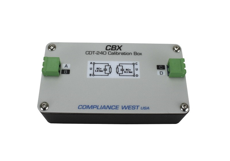 Calibration/Functionality box for CDT-240, used to calibrate and verify the proper function of the CDT-240, provides 2 RC constant outputs, 1s and 0.1s. Comes with leads to connect to CDT-240 front panel. NIST calibration supplied; A2LA calibration available.