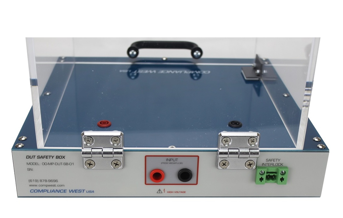 The MegaPulse DUT Safety Box is a 10″x10″x10″ testing enclosure, designed with interlock compatible with our MegaPulse testers, 1 set of inputs for MegaPulse and 1 set of outputs inside the interlocked plexiglass coverible. Rated for up to 5KVDC.