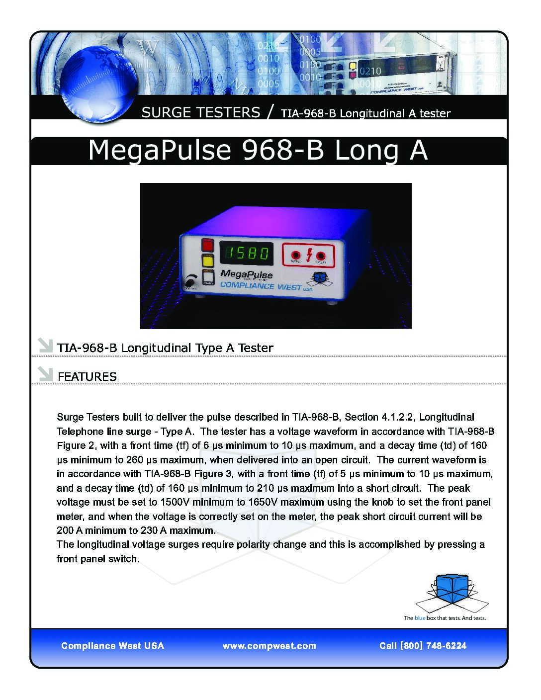 Designed to generate the surge test described in TIA-968-B, Section 4.1.2.2, Longitudinal Telephone line surge – Type A. Peak voltage is 1500 volts minimum, peak short circuit current is 200A minimum. A switch is provided for reversal of output polarity. TestMinder P USB computer control optional.